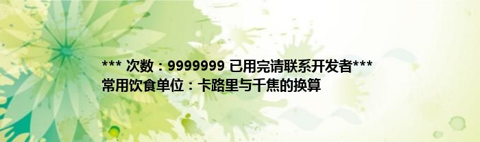 本文*** 次数:9999999 已用完请联系开发者*** 常用饮食单位:卡路里与千焦的换算到此分享完毕,希望对大家有所帮助。