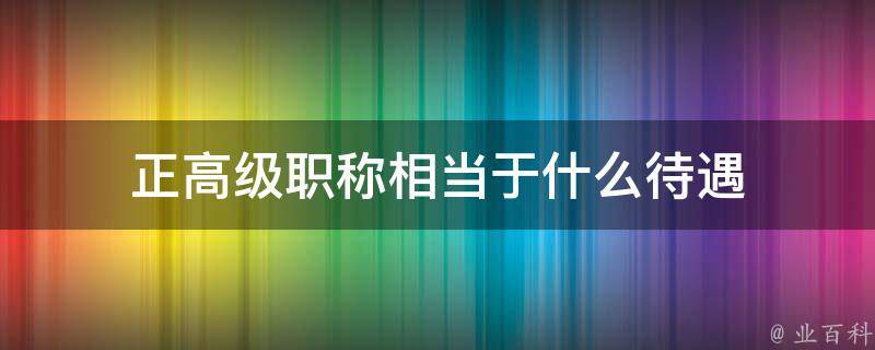 正高级职称相当于行政正处级别待遇。正高职称相当于行政正处级别,也享受行政正处级别的待遇。正高职称主要包括:教授级高工、研究员、主任医师、正高级会计师、教授、正高级教师、研究馆员、编审、高级记者、高级编辑、一级律师及公证员等。在影响升职、工资评定的各种因素中,正高职称往往具有很大的权重。