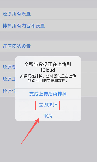 出现同步未完成提示,备份资料之后,点击立即抹除。