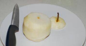 梨去皮,切去顶部;用圆形切模将梨核去除。
