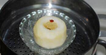 上锅蒸,水开后调小火炖1小时以上,取出后喝糖水吃梨肉,一天可分几次将其用完。