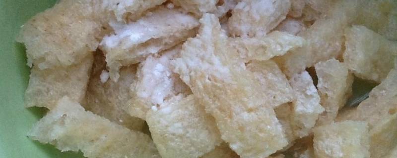 3、然后炸猪皮泡过以后,然后洗干净,再用刀把它切条。